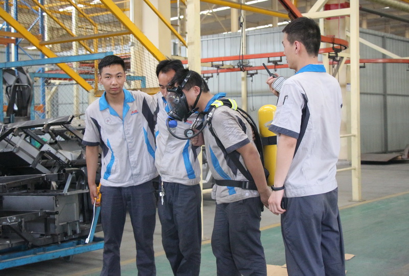 隨著總指揮一聲令下,演練正式開始,演練假設涂裝車間油漆烘干室天然氣管道及法蘭泄漏,有人因未佩戴防護用品中毒暈倒,同時發生火災,發現險情后現場員工立即報告相關領導并實施緊急救治。現場指揮接到險情報告后,立即啟動綜合應急演練預案,組織應急處置組、事故搶險組、消防保衛組、通訊聯絡組、環境監測及設備搶修組、物資供應組趕赴事故現場,進行緊急昏迷人員搶救、滅火救援及現場工作人員疏散。
